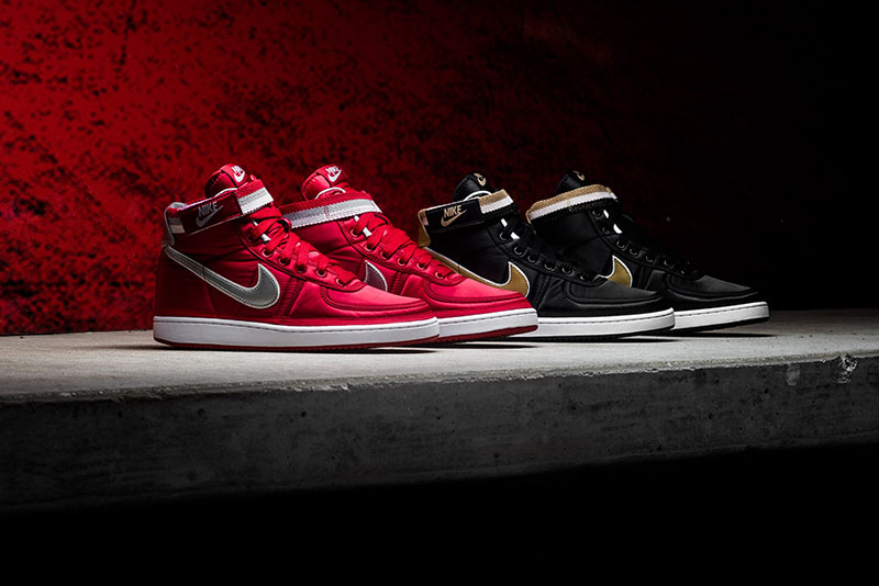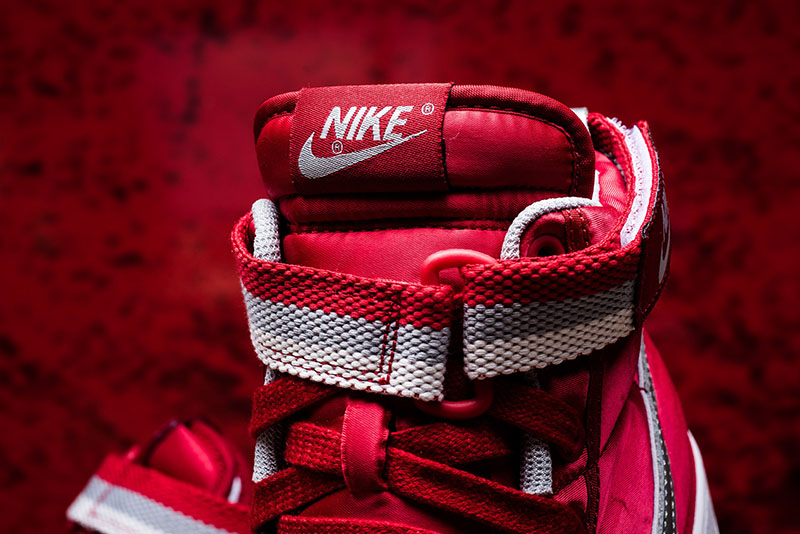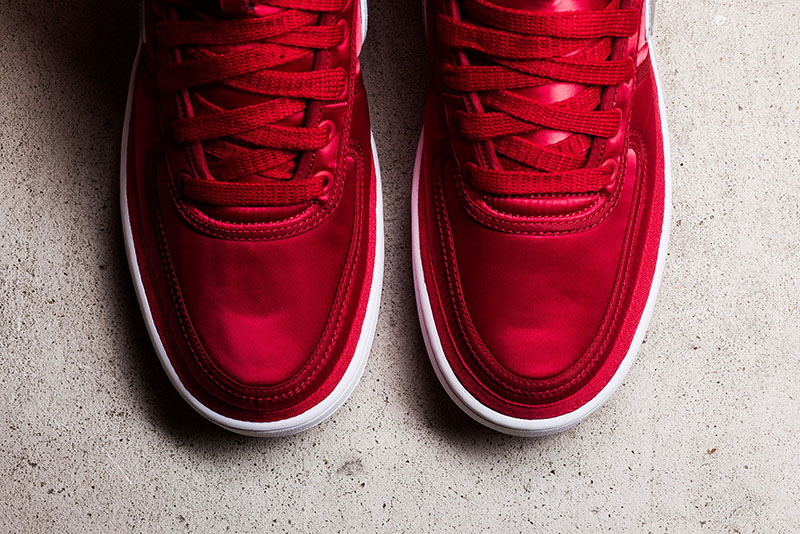 眼前这款红色 Nike Vandal High Supreme 新品,鞋身采用尼龙缎面打造,细腻的纯色营造散发出独特的光泽质感,视觉表现完全不输绸缎 AJ1!