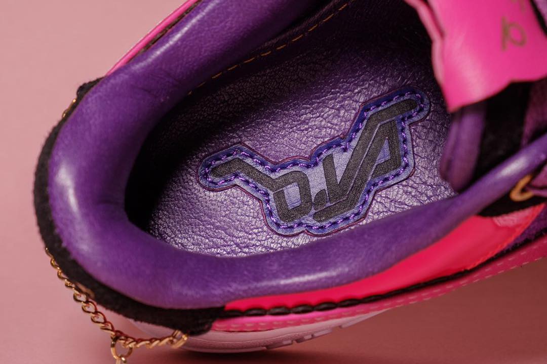 这双 Air Force 1 的设计细节可谓超级丰富,除了深蓝色的牛巴革材质上布满花卉图案之外,白色纯皮内衬又是用另一种花卉图案,后跟的马毛上则刺绣有 “冠”、“希” 两个大字,灯芯绒材质的鞋舌上则是冠希的英文名简写 “edc”,鞋带扣上则分别以金色刻印上冠希女朋友 “SHUPEI” 和女儿 “ALAIA” 的名字。