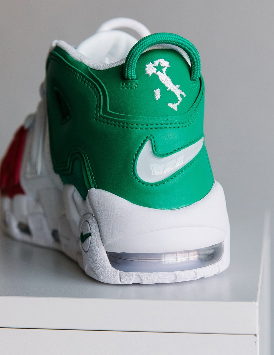 细节方面,三款 Air More Uptempo 后跟都有相应国家地图刺绣,意大利配色标注的五角星位置大约是米兰,法国配色标注的则是巴黎,而最后一个则为米兰。
