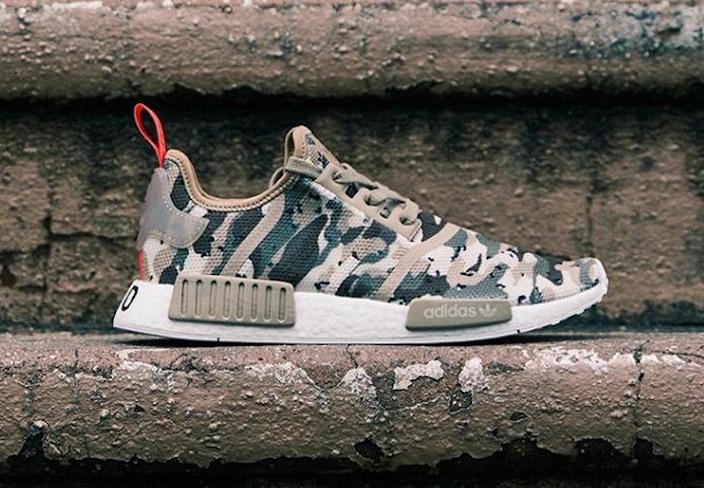 该系列与大部分市售的特点相同,三种迷彩色的网布鞋面与后跟处的橙色拉环。而全新系列在细节上更讲究,无论是 “沙漠迷彩” 还是 “军绿迷彩”,白色的 Boost 中底上都有超大 “NMD” Logo,而 “黑迷彩” 则是在黑色的 Boost 中底上以白色印花呈现,在左跟上为 “NMD” 而右跟则为 “NYC”,彰显纽约专属配色版本。