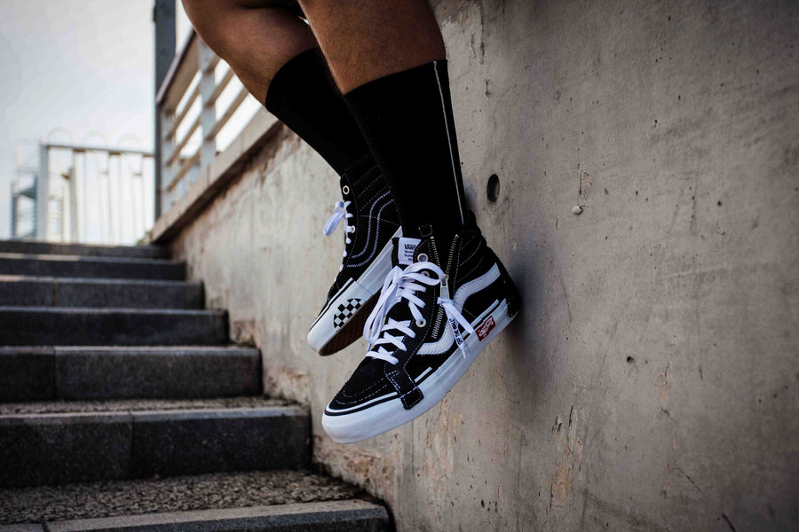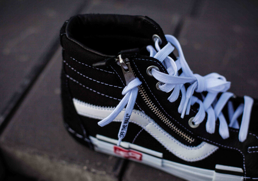 同时鞋带孔处的设计手法也将 Vans 本身的街头属性完美展现,而最显眼的设计便是在鞋身侧部的那根从鞋帮一直延伸到鞋面的金属拉链,著名的 YKK 拉链头上甚至还系着半根剪断的鞋带,印着那句经典的 Slogan:“OFF THE WALL”。