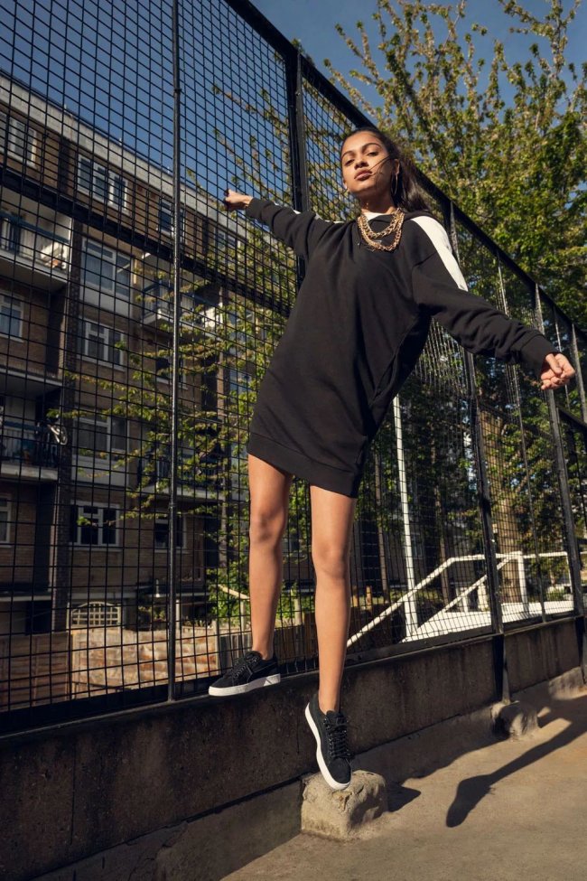 简单一件裸粉色长款连帽卫衣搭配相同配色的 PUMA SUEDE,就能轻松展现演绎出与平时截然不同的劲酷街头潮范儿。