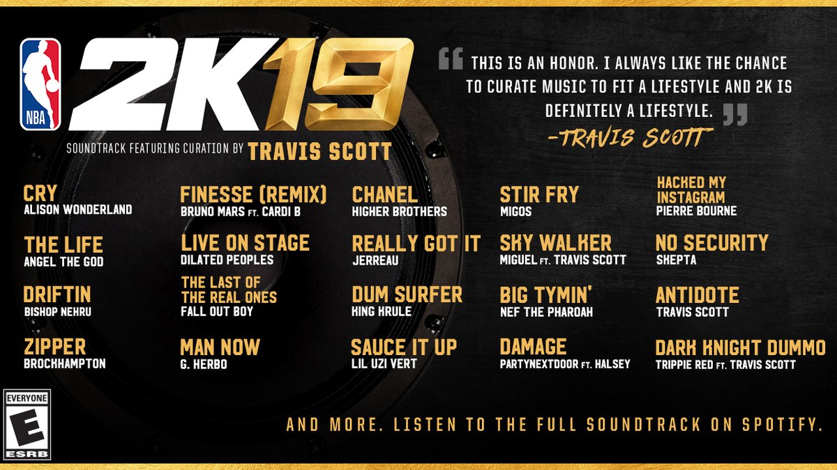 NBA 2K 系列中的音乐一直各位玩家最值得注意的重点之一,而在此番的《NBA 2K19》当中,Travis Scott 则制作一份专属歌单,可见近日 Travis Scott 的活跃程度!除此之外,更值得我们注意的是国内 Hip-Hop 组合 Higher Brothers 也被选入歌单,这对于广大中国玩家来说可谓是锦上添花!
