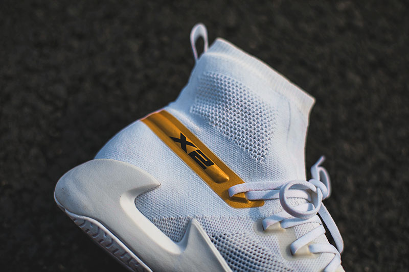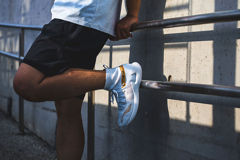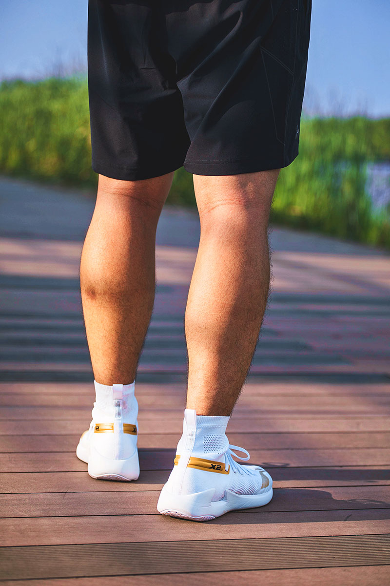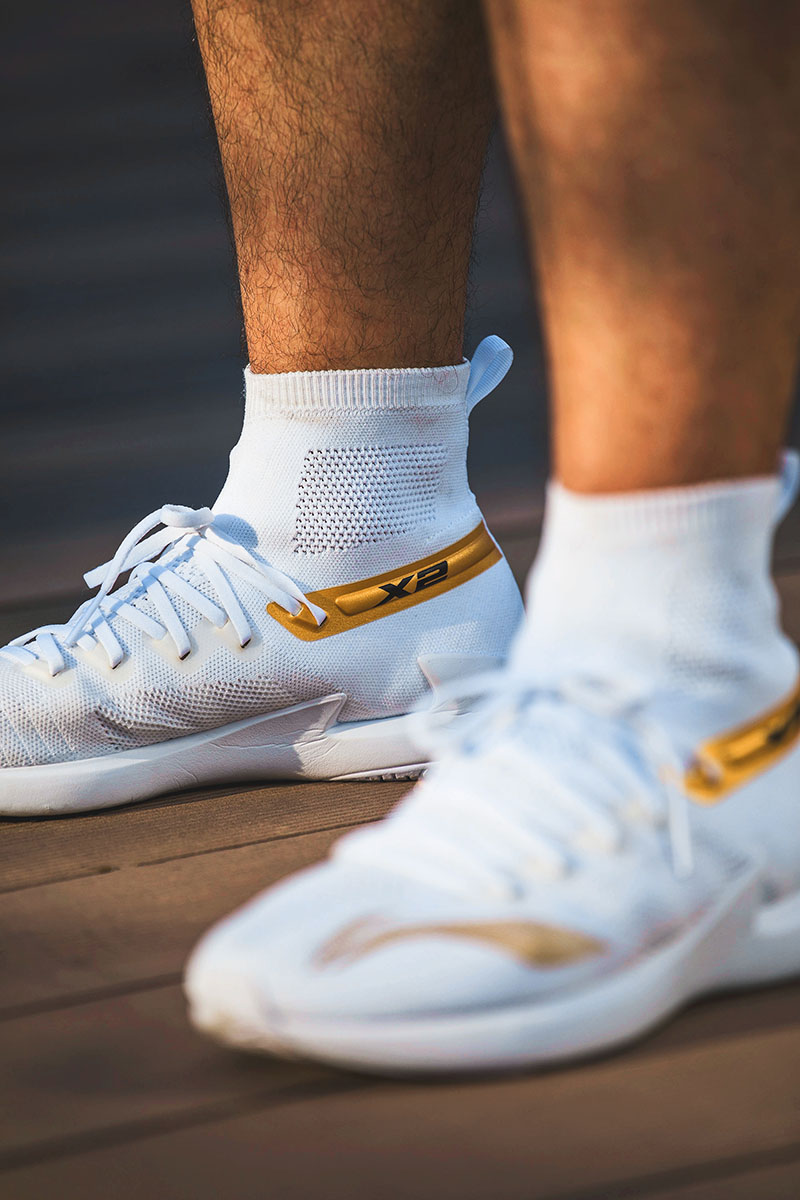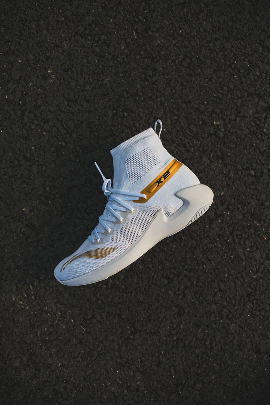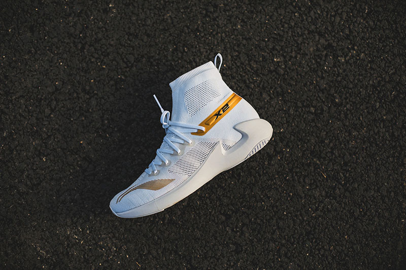后跟内嵌杯状 TPU,在鞋帮处进行热熔包裹,金色 BMW X2 专属标识与洁白鞋身上的 Li-Ning 条纹 Logo 相呼应,速度感满载!