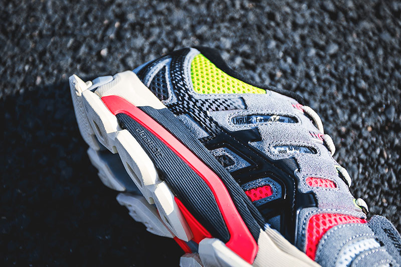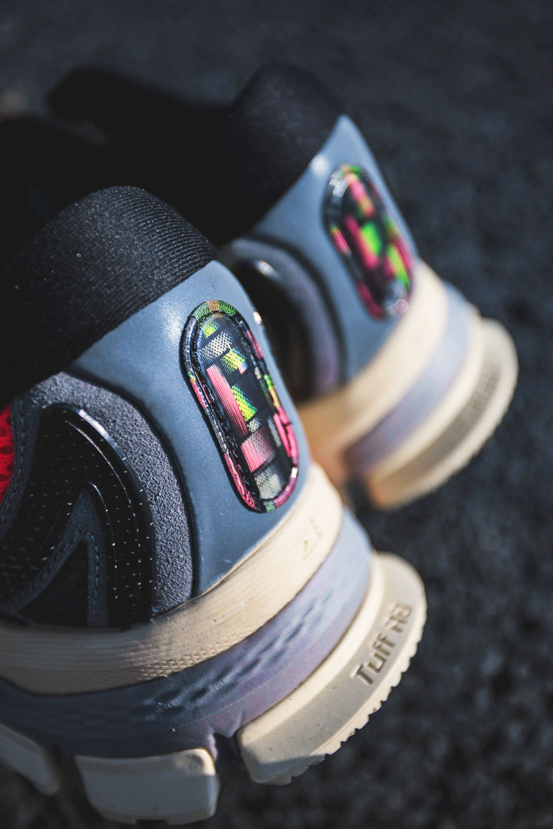 鞋身采用多种材质拼接打造,除了透气网布外,荔枝皮、麂皮、3M 反光材质、透明材质以及后跟镭射闪卡,都恰当的安置在鞋身的各处细节。
