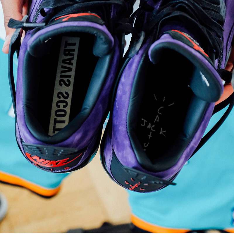 而这双本人多次上脚的紫色配色采用了与蓝色相似的细节装扮,紫色的整体色调更为骚气。后跟处同样 Cactus Jack 主题呈现,以致敬 Travis Scott 的音乐厂牌,而区别则是紫色版的鞋垫同样以突出该主题设计。