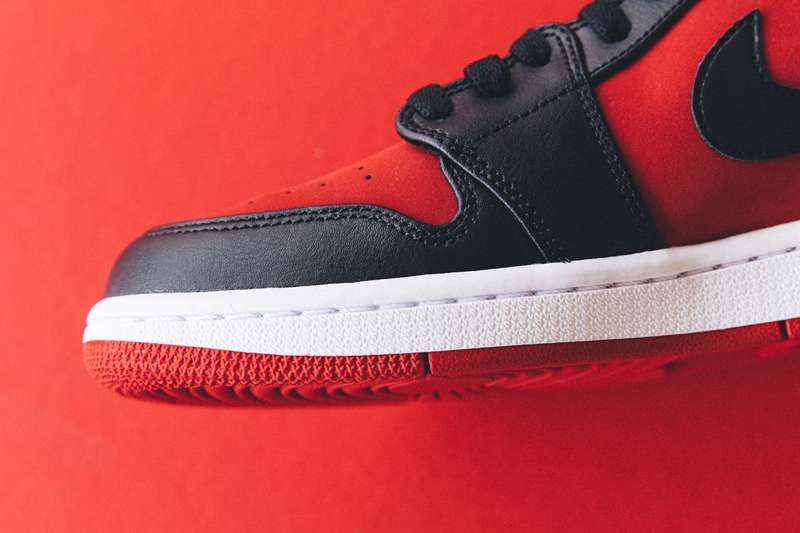 鞋款整体以黑红配色为主调,鞋面并没有采用荔枝皮,与 9 孔鞋款极为相似,只不过在鞋身处的黑色和红色翻转过来,醒目程度毫不逊色 Air Jordan 1 Bred OG。