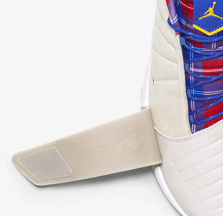 鞋款整体以卡其色主调,除了鞋身上荔枝皮与麂皮拼接的高端用料,魔术贴上的飞人 Logo 以金色点缀,为鞋身增添奢华气质。