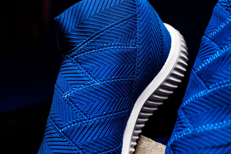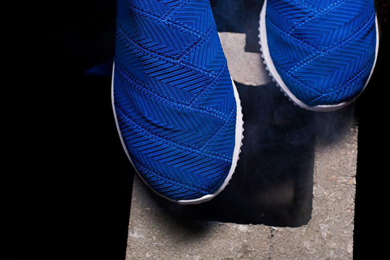 鞋款整体以极为跳跃醒目的蓝色贯穿,中帮袜套式的织物鞋面纹理细腻、层次丰富,搭配 Bounce 缓震科技中底脚感软弹出色,但保持了系列一贯的几何交叉设计风格,开孔设计的鞋底带来更加清爽的透气体验。