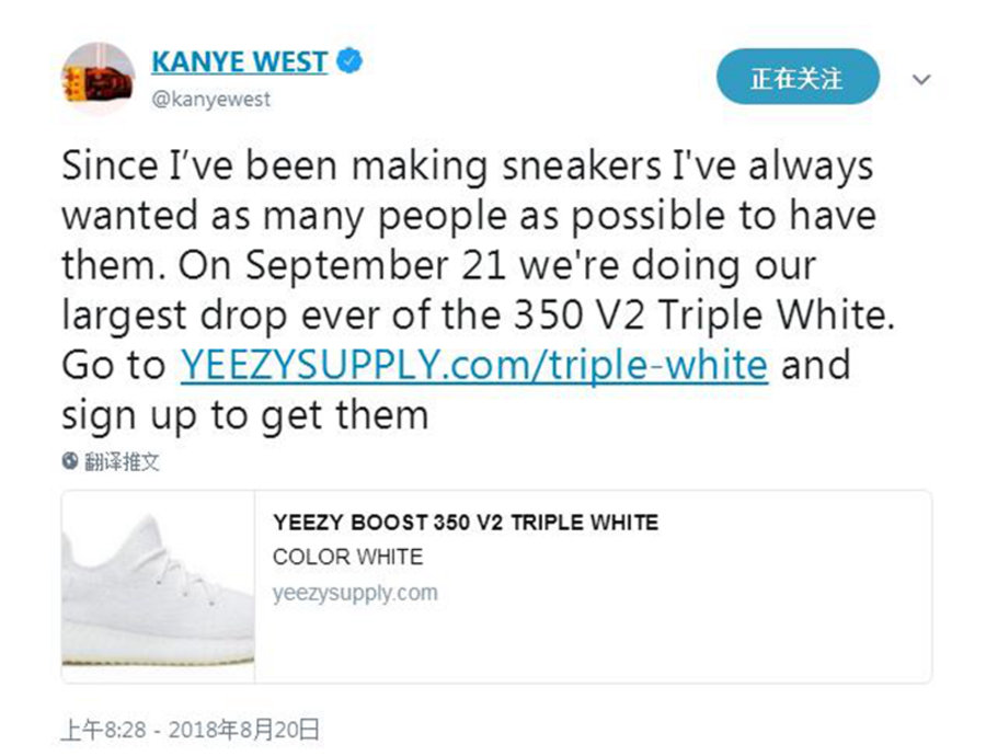 Kanye West 在 Twitter 中称,这次纯白发售将会是最大货量,国内发售量可能也不小,只要在发售时做好准备,或许会有很大概率原价入手。