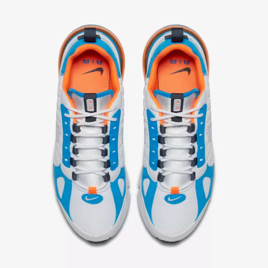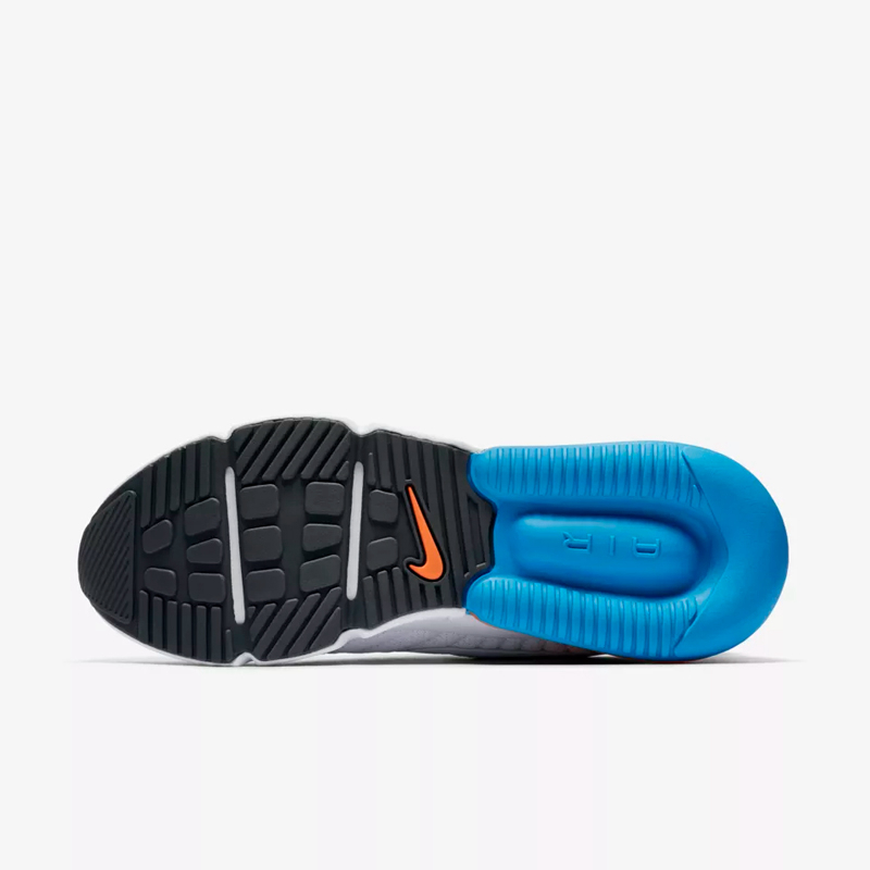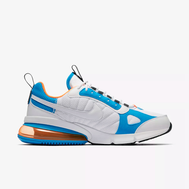 与 Air Max 270 的前卫时尚不同,这双 Air Max 270 Futura 的鞋面带有浓郁的复古风格,配色以白、蓝两色为主调,气垫、领口处加入橙色点缀,后跟部位改成复古风格的 Nike Air 标志。