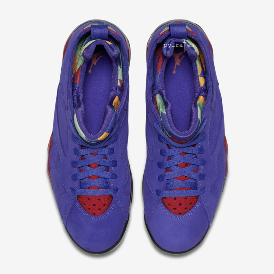 这款 “Bright Concord” 配色鞋面以蓝紫色牛巴革材质打造,中底点缀红色细节,内靴为 AJ7 中常见的彩色几何设计。虽然是全新配色,但亮眼的同时毫无违和感。