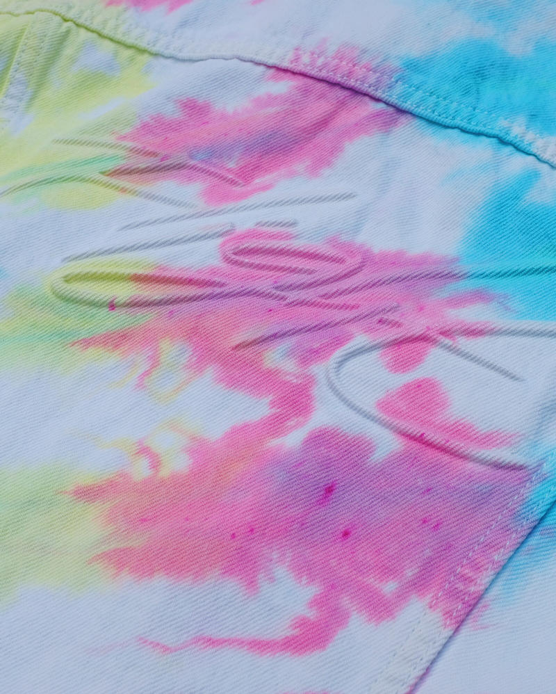 与传统的单色扎染不同,此次 Larry Luk 采用的是古法扎染,将白色的鞋身扎染成彩虹色,极具艺术效果的同时,更展现的独特的设计手法,Levis 牛仔夹克同样为彩虹扎染,极其绚丽的设计理念。