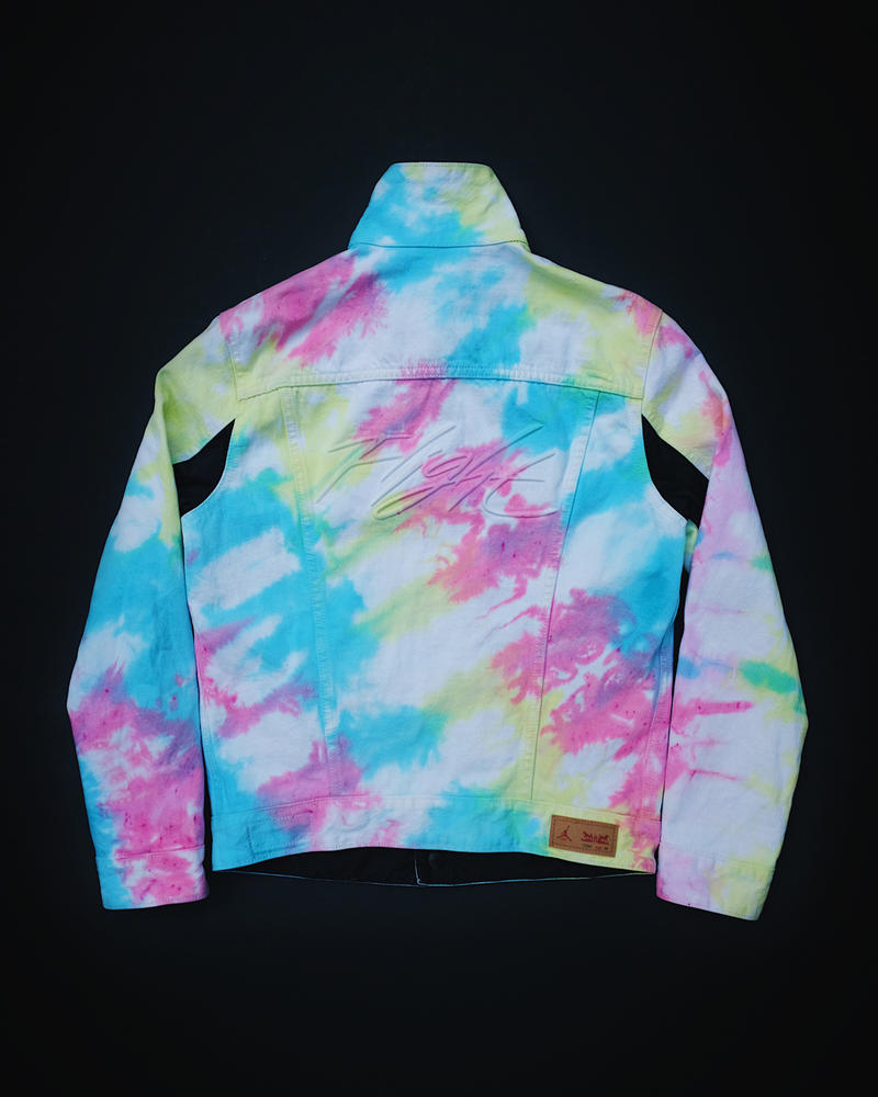 除了扎染客制了纯白色 Levis x Air Jordan 4 之外,Larry Luk 还带来了一件扎染设计的白色牛仔夹克,展现他本人向复古扎染文化的致敬。
