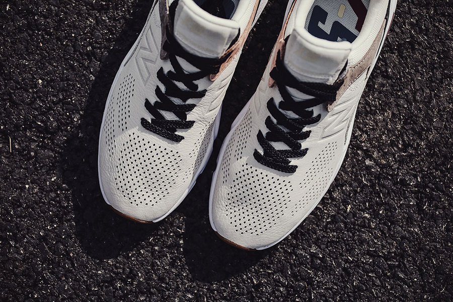 鞋头部分依旧使用打孔的设计增加透气效果,但是并没有像 99X 系列一样,加入过多的材质或者缝线,反而是由整张皮革打造而成,营造出流线简洁的外型。