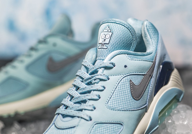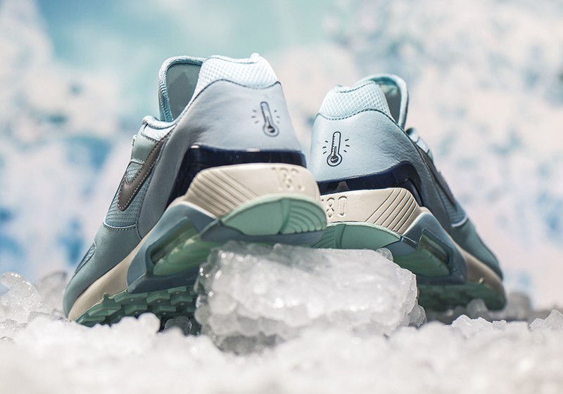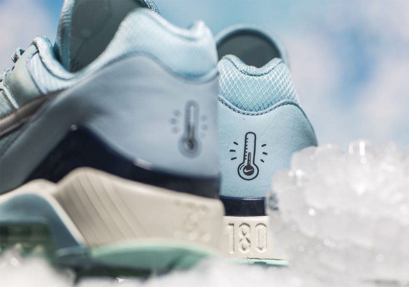 两双配色均施以独特细节在鞋舌上,分别刻画了一个穿着 Air Max 180 的卡通小人。“Ice” 配色冰块脑袋小人头顶冷帽,“Fire” 配色火苗脑袋小人戴着墨镜,十分有趣!最后在鞋款后跟印有温度计,一个冰点一个火热,再次展现鞋款主题!