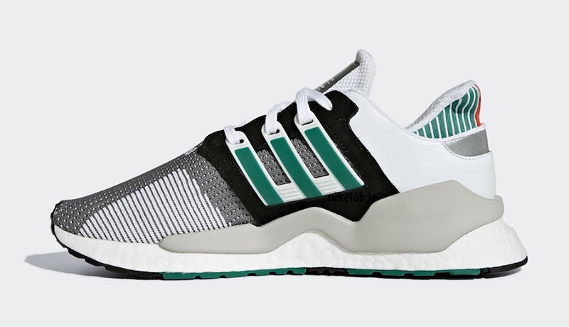 鞋型脱胎自诞生于 1991 年的 EQT Torsion 跑鞋,编织鞋面采用白、绿贯穿,细节辅以黑、红点缀,能看出不少 EQT 93/17 的影子,典型的 EQT 主打配色,致敬经典。
