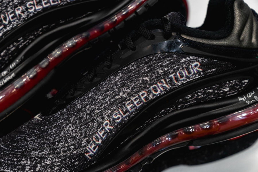 鞋面内侧还印有 “NEVER SLEEP ON TOUR” 的口号,彰显说唱歌手的独特个性。