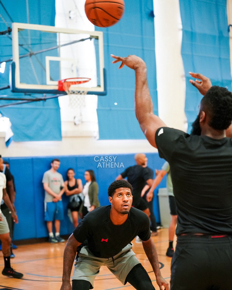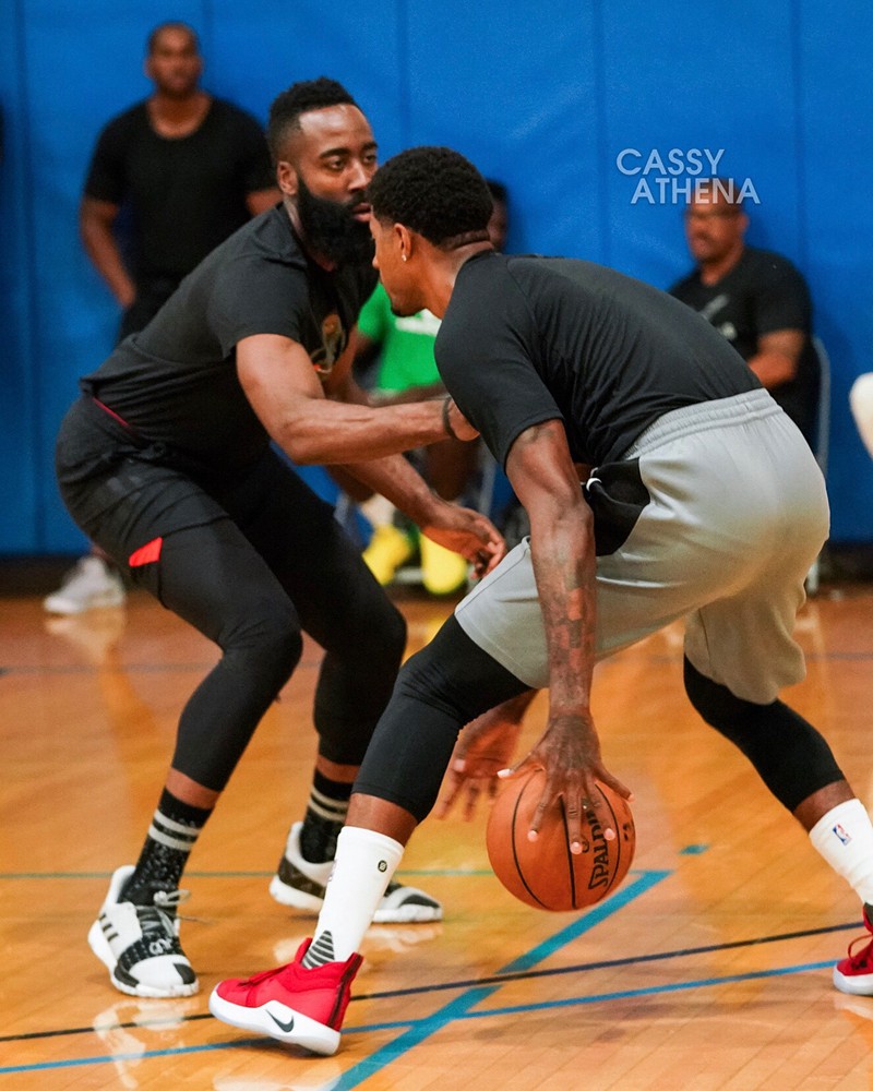 图组中与哈登对位的是保罗 · 乔治,而他也上脚了一双大红色的 PG 2.5 最新签名鞋款,同时两人穿着印有各自 Logo 的 T-shirt。不同品牌 + 不同球队的核心球员,场面也是颇有趣味!
