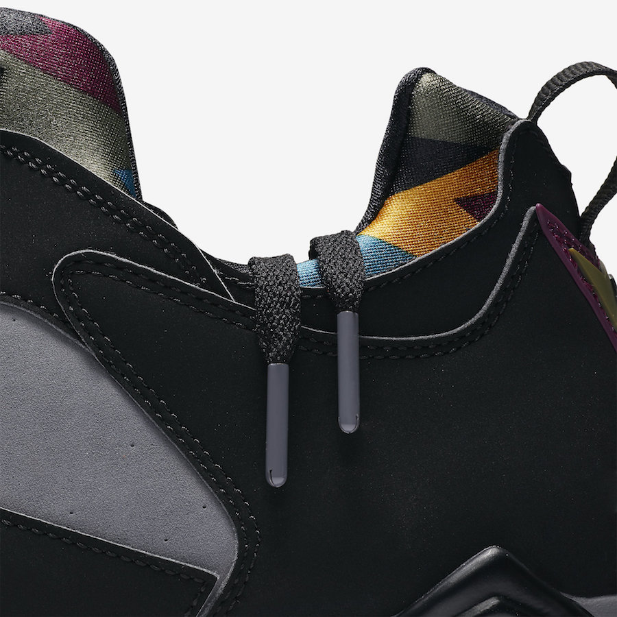 配色上依旧采用黑灰拼接鞋身搭配多彩鞋舌、内靴和外底,细节以多彩几何装扮呈现,而后跟则是致敬了 OG 版本的设计以经典的 “23” 徽章点缀,细腻的反差点缀设计是它的魅力所在。