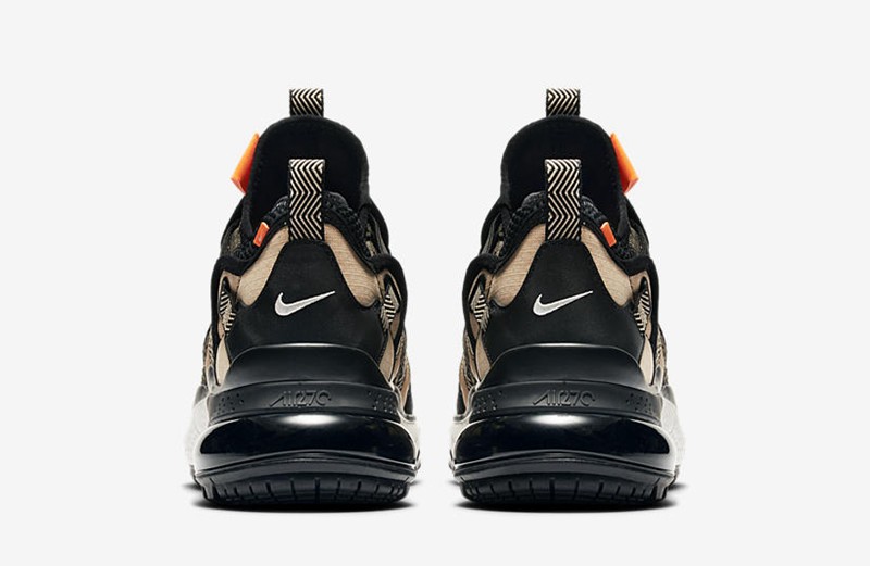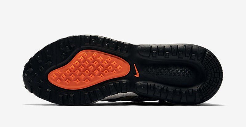 最大亮点为从鞋跟一直到前足,黑白人字纹的绑带环抱整双鞋面,创造出独特的鞋带系统,配合登山风格鞋带以及弹簧鞋带扣。一大一小橙色 Nike Tag 点缀于鞋舌与鞋领。最后米白色前掌 EVA 中底搭配纯黑色 Max 270 大气垫,外底酷黑之余带有橙色十字块状纹路,增强鞋底防滑性。整体造型极具户外风格,搭配 ACG 服饰想必是绝佳拍档!