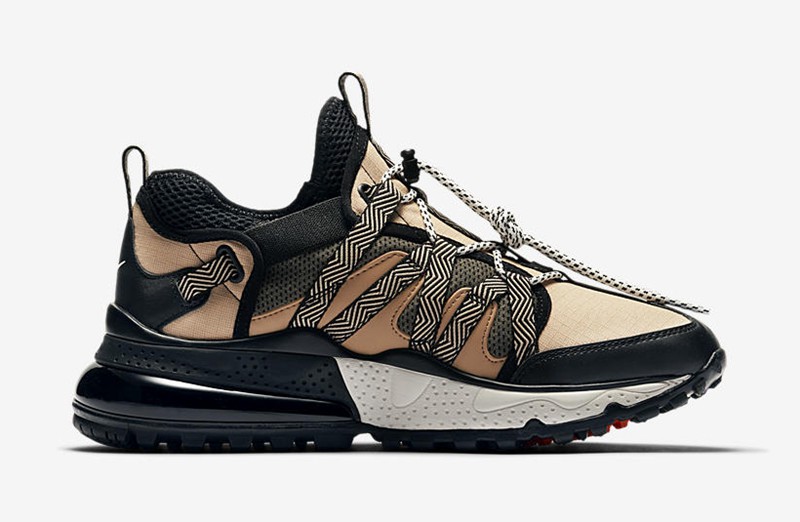 此双 Air Max 270 Bowfin 采用多种大地色系的合成物料拼接打造。类似于 Air Max 95 的黑色光面皮鞋头设计,并以浅卡其色 Ripstop 防撕裂尼龙材质为鞋面主体,搭配侧身军绿色网面搭配浅卡其色麂皮,以及后跟的麻布质感材料。