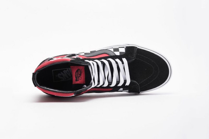 鞋面由麂皮打造,以黑色鞋头搭配红色鞋帮,鞋面还加入 Vans 最经典的棋盘格元素。