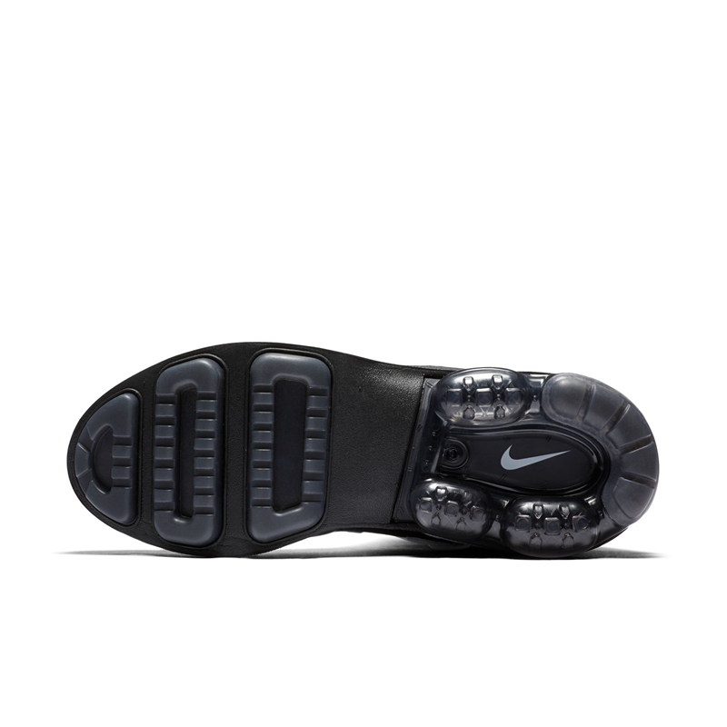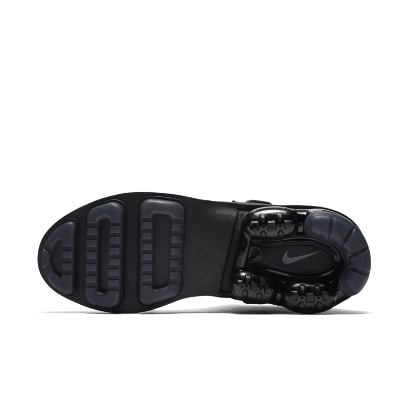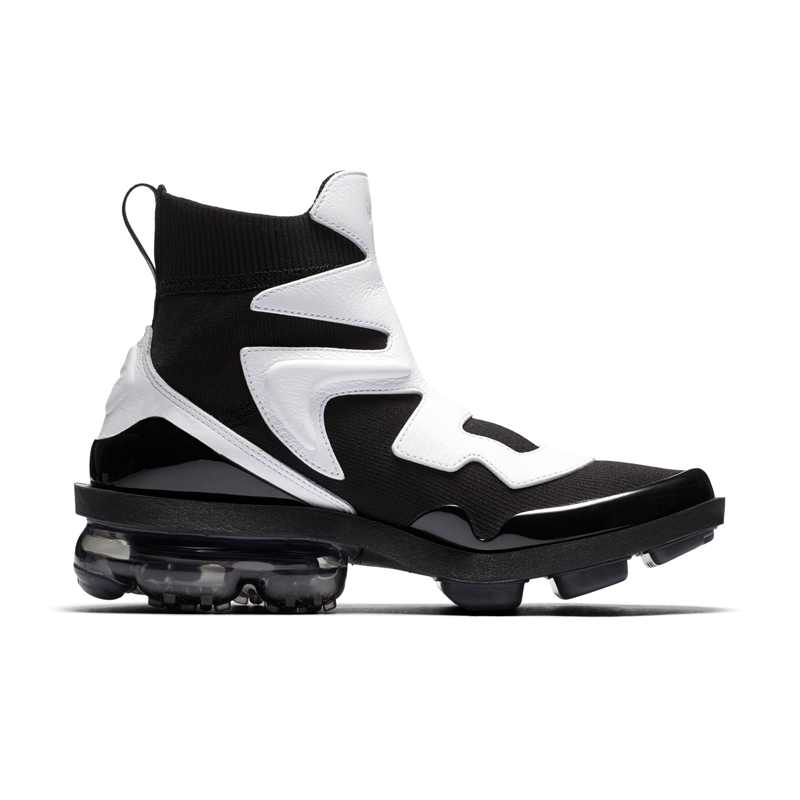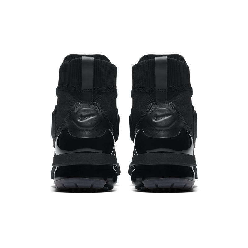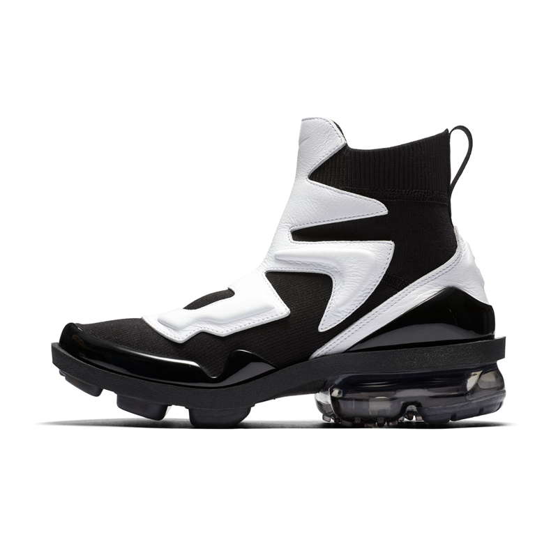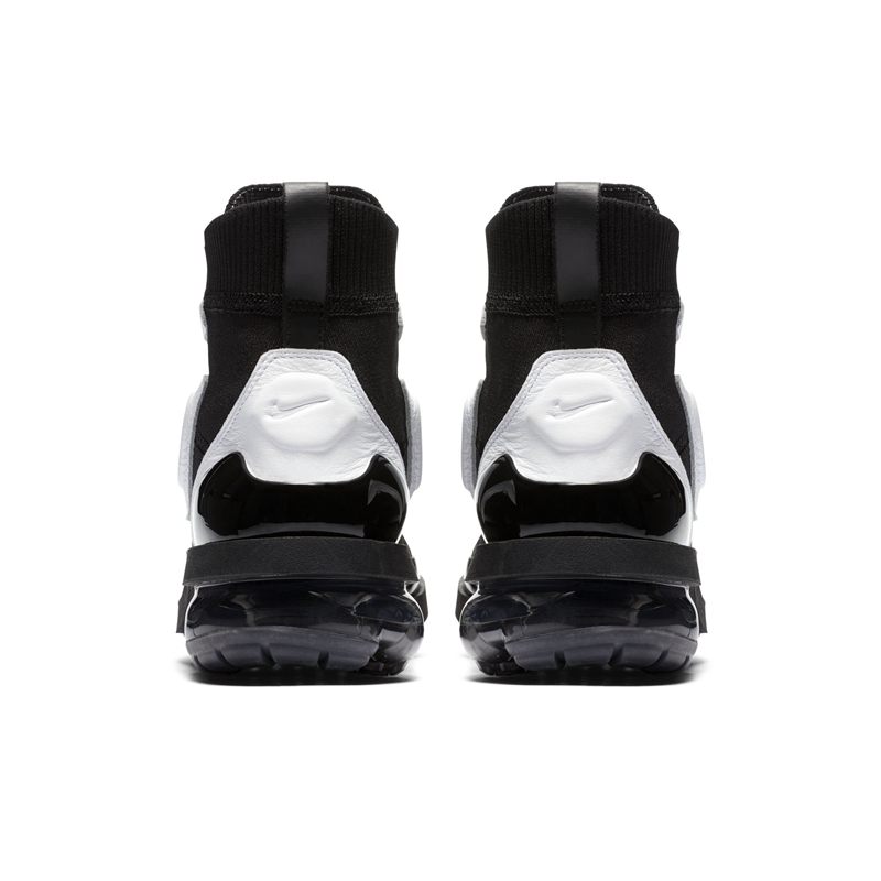 配色方案为一双纯黑一双黑白撞色,设计切割的优质皮革搭配合成织物面料,同时鞋头与后跟的保护采用光泽度极佳的 TPU 材质,最后以中底 EVA 材料搭配后掌 VaporMax 气垫,营造出极具时尚感的高帮造型。
