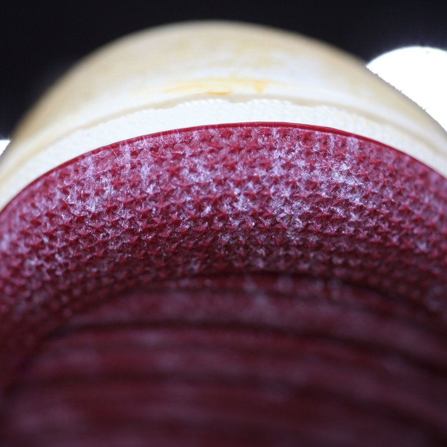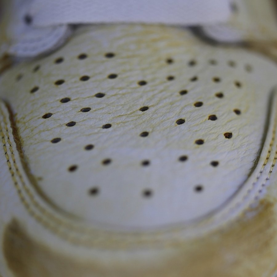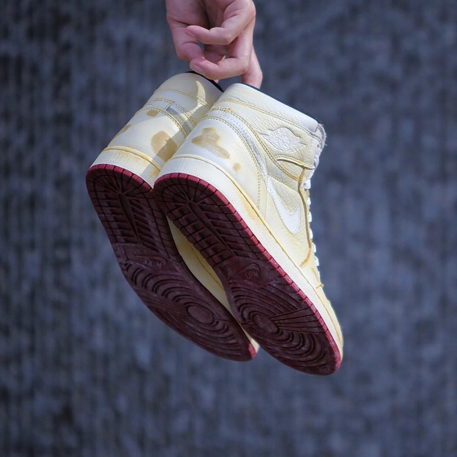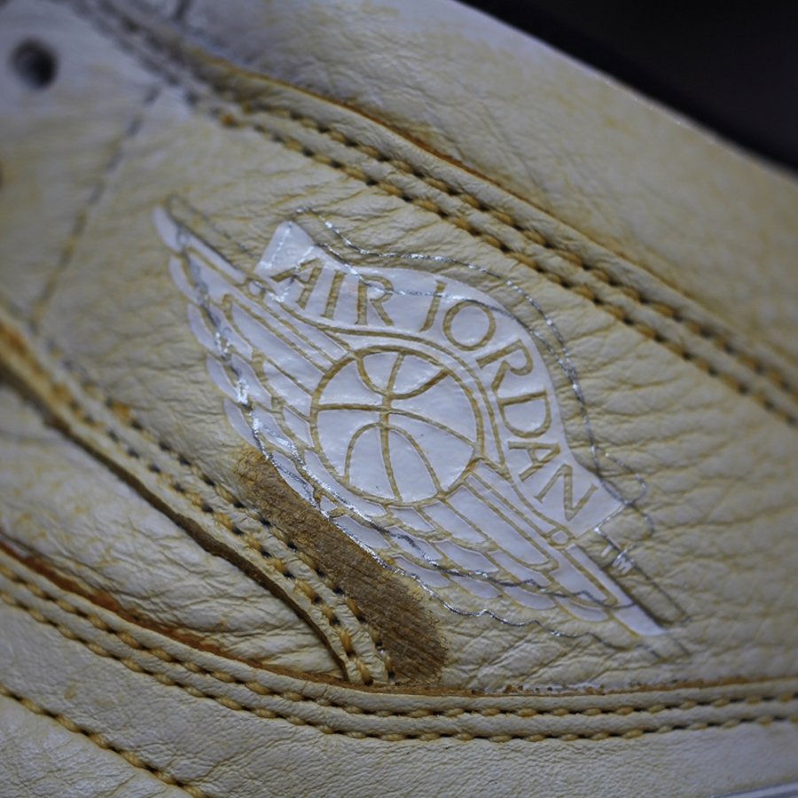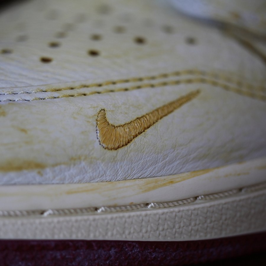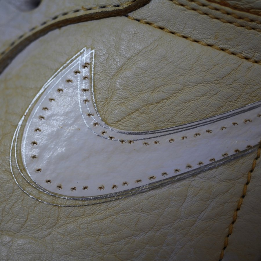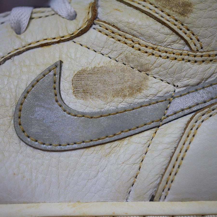 此外鞋款最吸引人的细节就是 Air Jordan 1 传统的 Swoosh 被故意拆线取下,并将空出部分施以 3M 反光涂层,反射光线时与泛黄鞋身形成强烈对比,视觉效果极为突出!