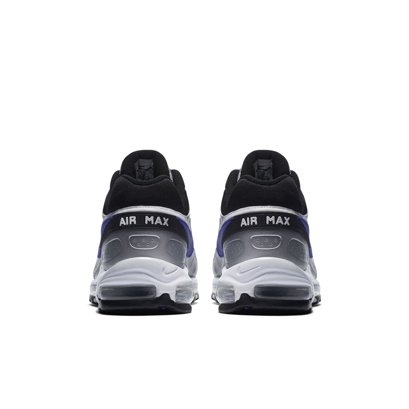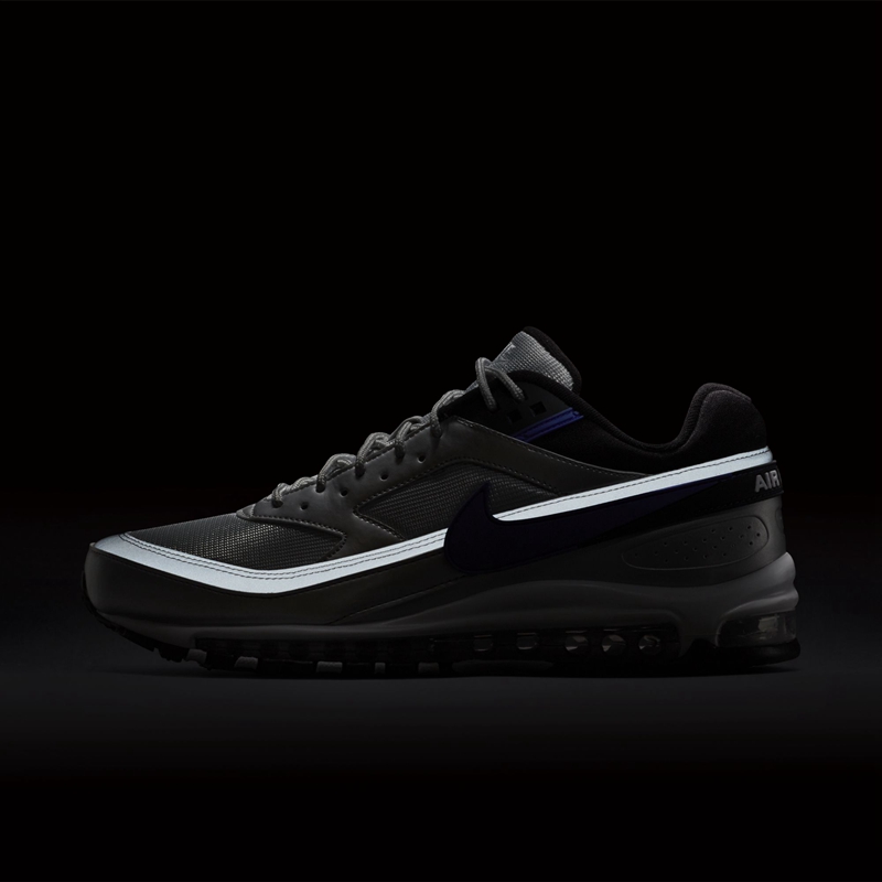 颜色方案采用了大面积的金属银,并将蓝紫色点缀于鞋领处以及侧面 Swoosh 上,围绕鞋款一圈的白色部分实为 3M 材料,反光效果与 Air Max 97 的视觉观感极为类似。