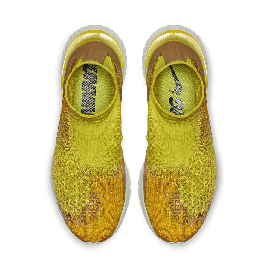 目前一款全新的高帮袜套版本 Rise React Flyknit 官图释出,鞋身整体由黄色与白色进行渲染,中底延续了 Epic React Flyknit 完全相同的 React 缓震,鞋面搭载 Flyknit 材质高帮袜套设计,并采用无鞋带设计。