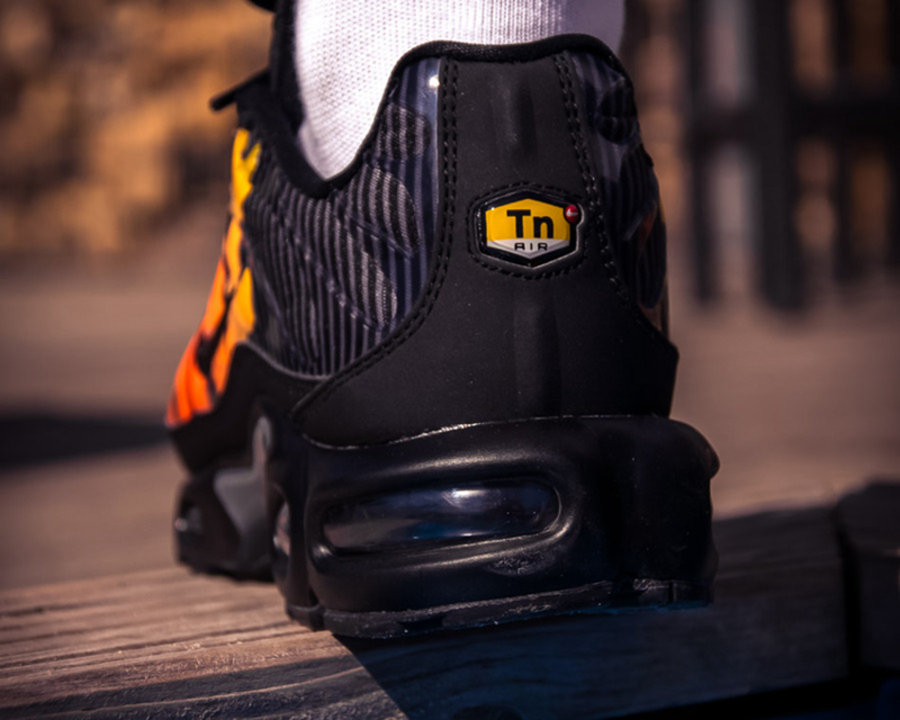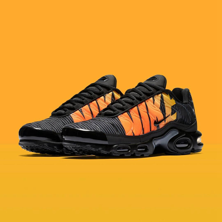 以纯黑为主色调,鞋面加入灰色线条。鞋面印有巨大的黄橙渐变 “NIKE” 字体,侧面的 Swoosh Logo 则被弱化,令本就夸张的 Max 大气垫鞋款更加炫酷。