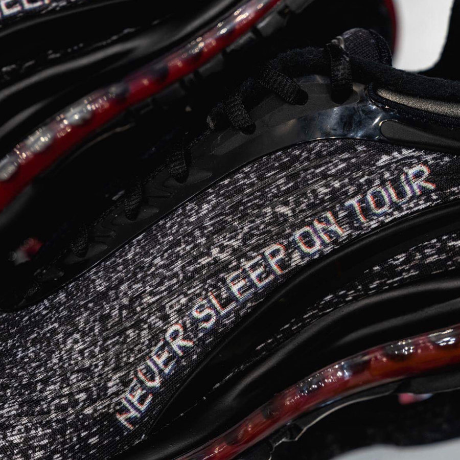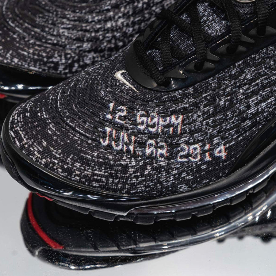 目前曝光的实物图中,最醒目的设计就是鞋面上印有的白色噪点字体 “12:05 PM JUNE 08 2014”,意为当年 Skepta 单曲专辑 “That's Not Me” 的发售时间。内侧的白色文字 “NEVER SLEEP ON TOUR” ,蕴含 Skepta 非常浓郁的个人元素。