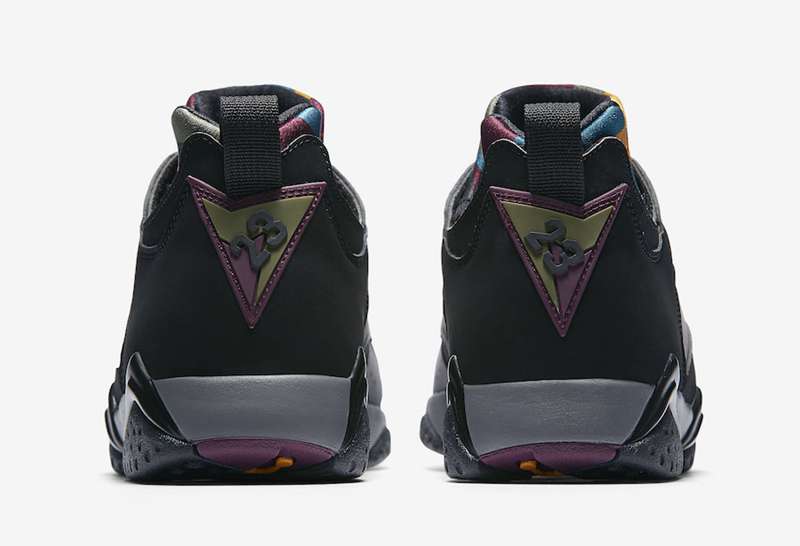 配色上依旧采用拼接鞋身搭配多彩鞋舌、内靴和外底,细节以多彩几何装扮呈现,而后跟则是致敬了 OG 版本的设计以经典的 “23” 徽章点缀,细腻的反差点缀设计是它的魅力所在。