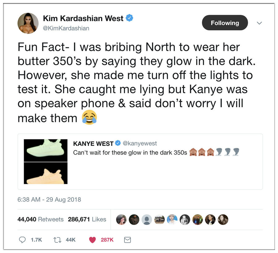 而作为球鞋玩家,自然还是对阿侃亲晒的 夜光 Yeezy 350 V2 更感兴趣,近日卡戴珊在自己 twitter 上曝料,其实这双夜光球鞋的诞生,还隐藏着一个有趣的故事。