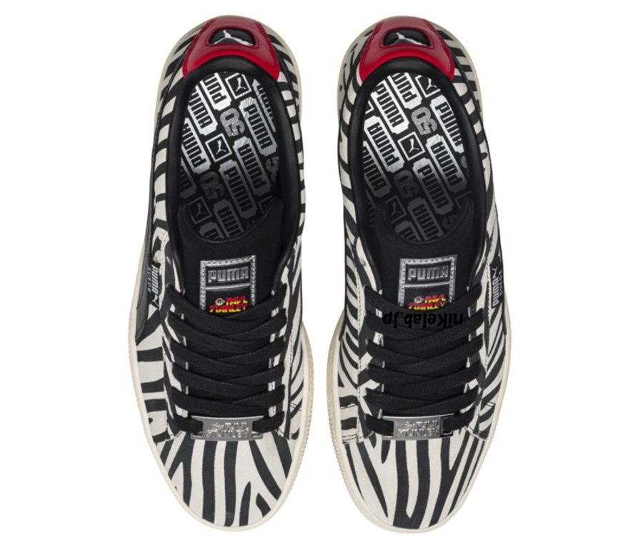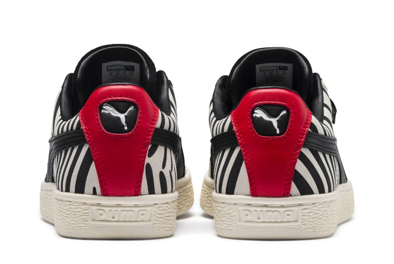 鞋面由麂皮打造,以黑白斑马纹装扮,就像 Paul Stanley 黑白双色的妆容一般极其醒目,后跟处的红色致敬他妆容的红色嘴唇。