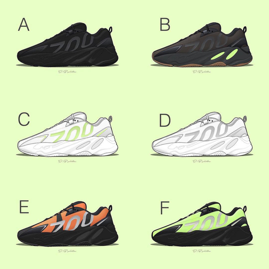 鞋底依旧是与 Yeezy 700 相同,但鞋面并没有复杂的拼接,大面积地使用了织物材质,其上以巨大的 “700” 装饰,造型极为夸张。