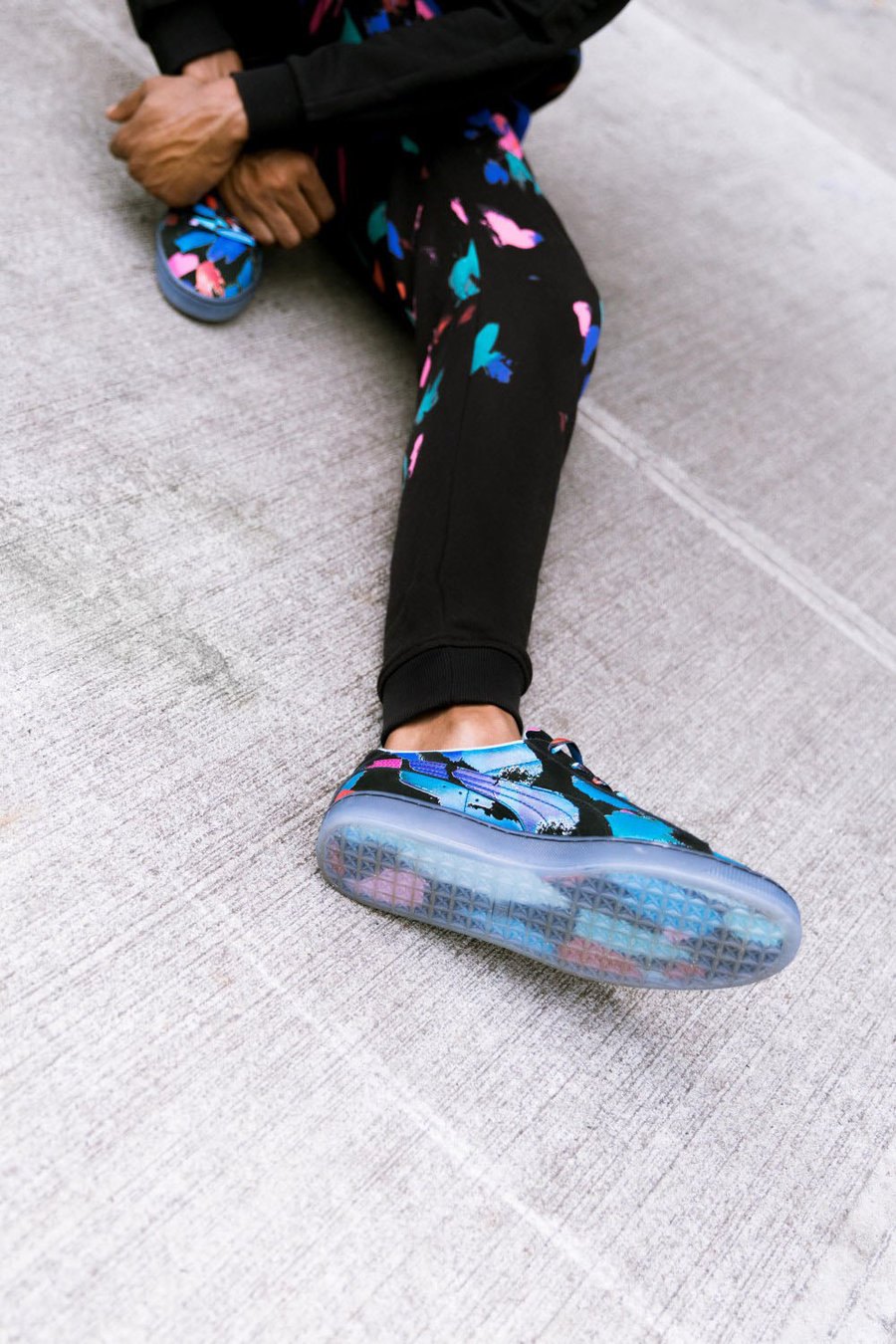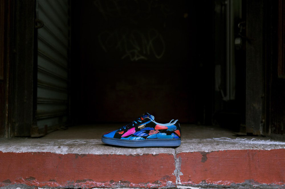 联名鞋款以 PUMA 最经典的 Suede 鞋款为蓝本,在黑色麂皮背景下,加入鲜亮的蓝、粉、红色不规则涂鸦点缀,细节中还有醒目的烫金点缀提升质感,最后搭载冰蓝色水晶底,浮夸且充满街头气息。