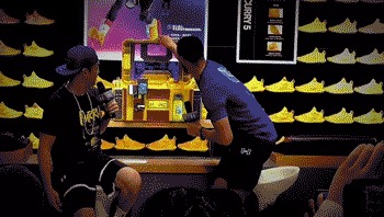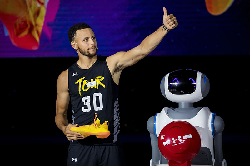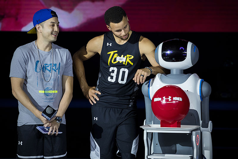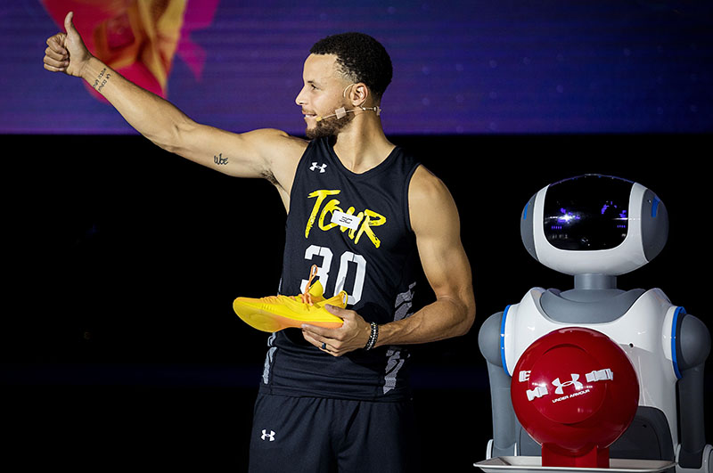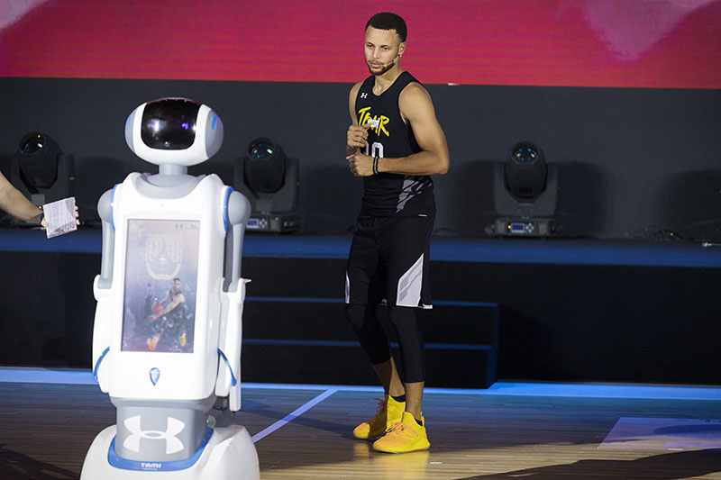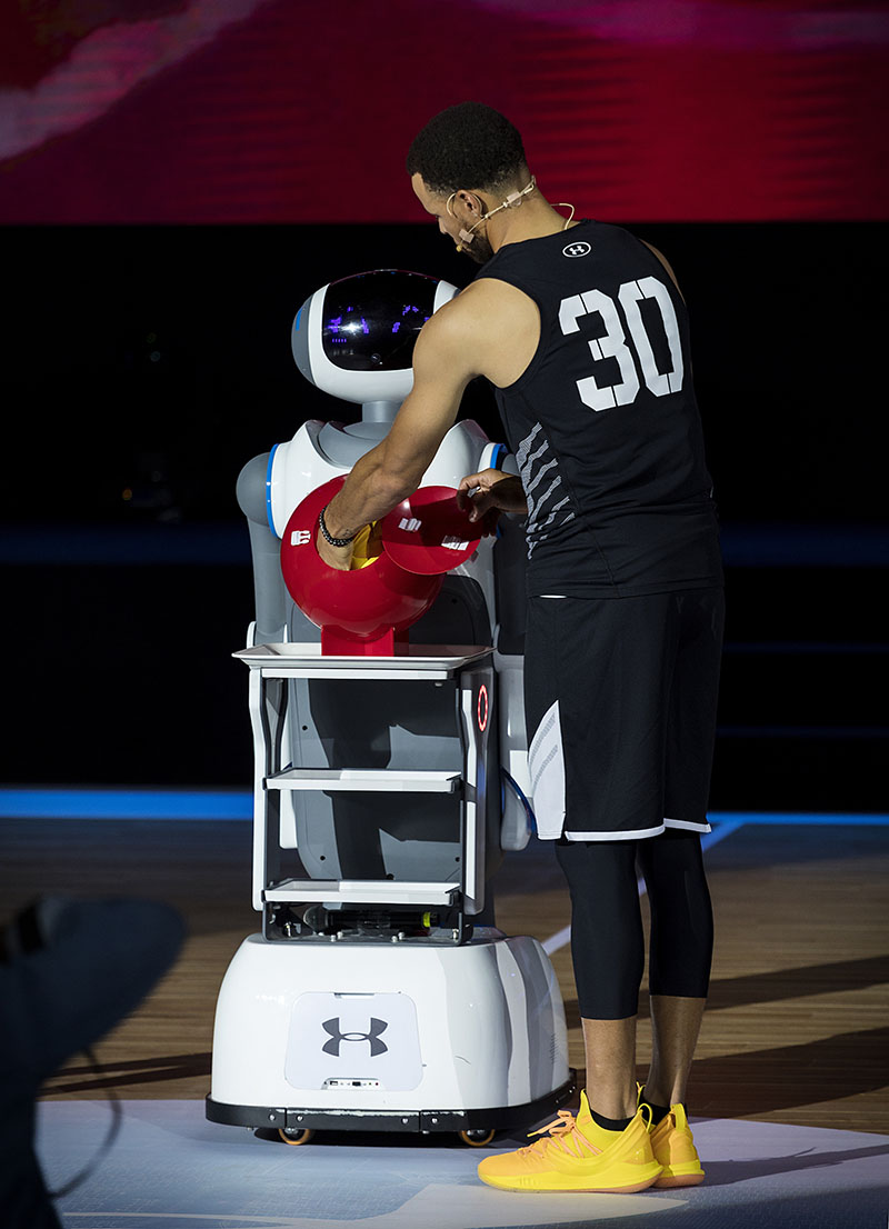 在主持人 Jason 唐志中的简单访问后,智能机器人将 Curry 5 亚洲行特别配色战靴送到库里手中。