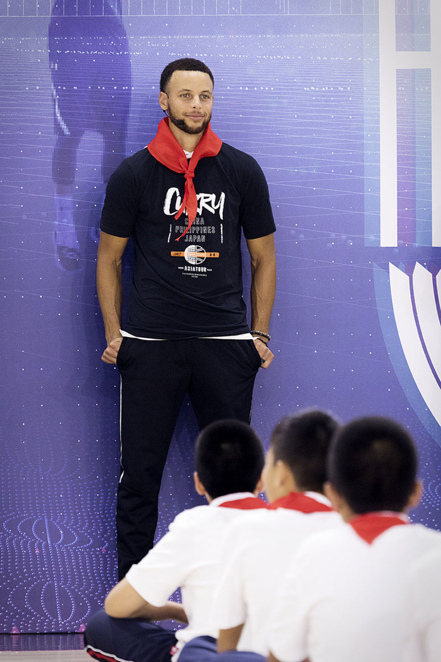 训练结束后,库里来到学生们面前,被受邀系上了红领巾,名正言顺的成为了如假包换的 “小学生”。