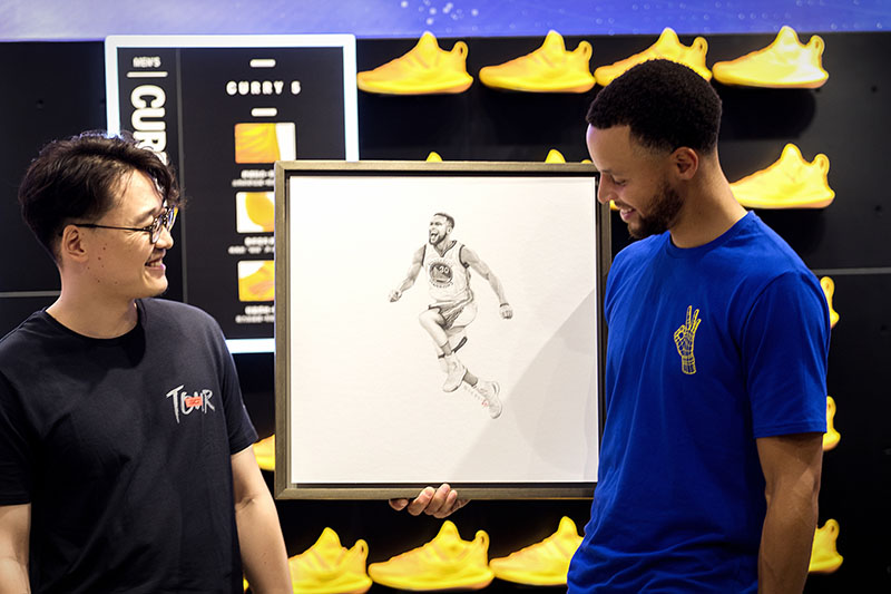 国内著名插画师韩乙田为库里准备了一幅经典庆祝动作的素描和一双特别绘制的 DIY 战靴。