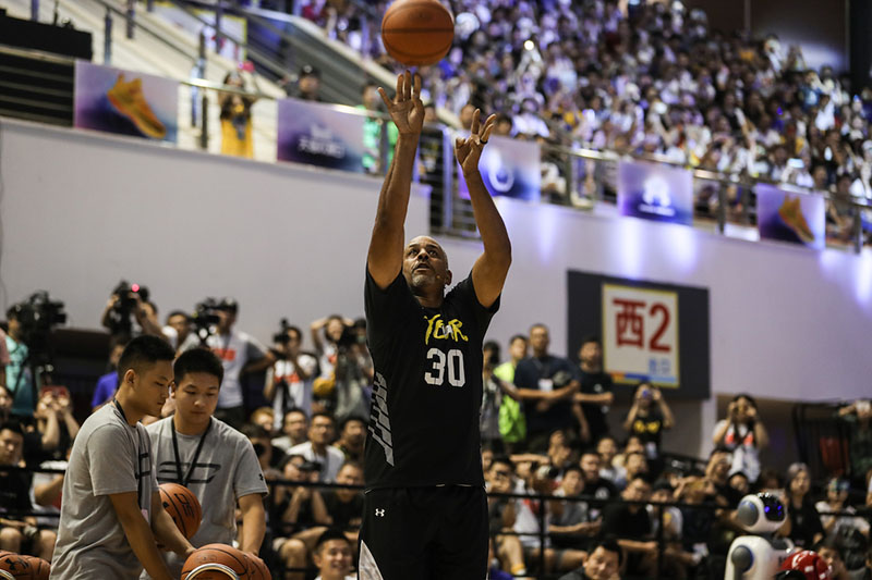当活动开始前,媒体抵达现场,库里早已跟训练师在一旁的场馆内挥汗如雨,由于是非活动的私人时间,同样被告知禁止拍照。