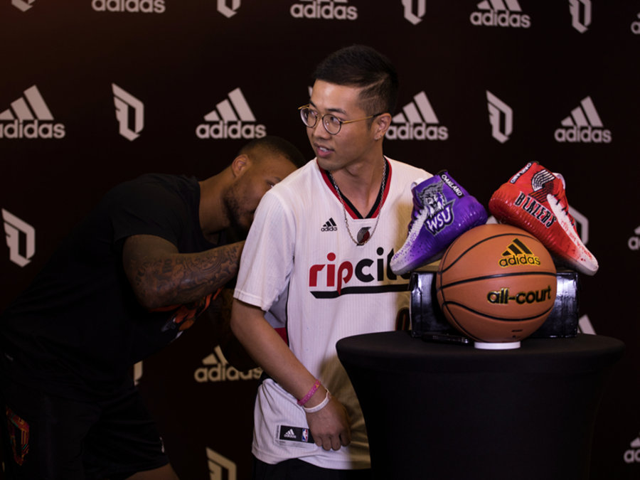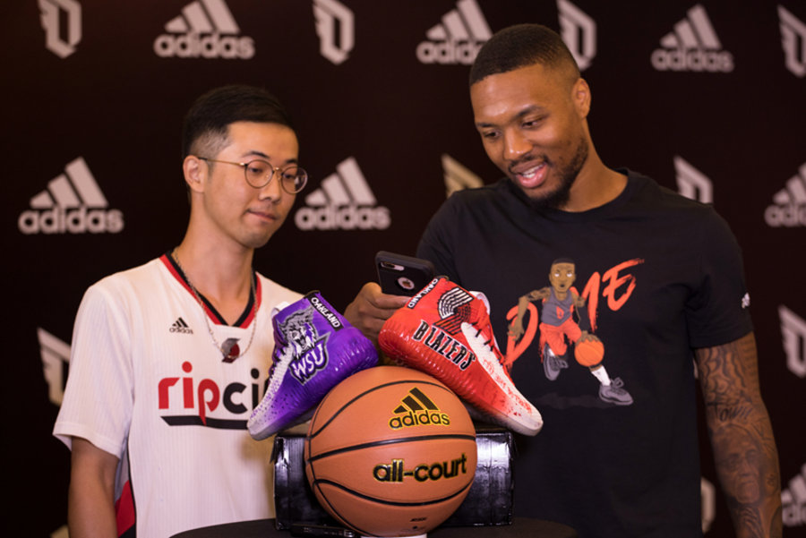 访谈结束后,球鞋定制师 @yWM_zero 为利拉德送上了一双定制版 Dame 4。两只脚非别为紫色和红色主题,分别代表利拉德母校韦伯州立大学和现在效力的球队波特兰开拓者。