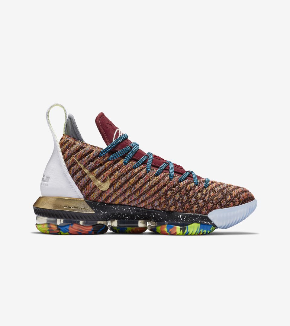 “Fresh Bred”、“Strive for Greatness”、“20_20 Vision” 以及 “Promise” 和 “King” 这五款经典配色方案,都在这双 LeBron 16 “What The” 中一一呈现,致敬经典的同时,再度强调 LeBron James 本人在球上场 “1Thru 5 ” 的统治级表现。