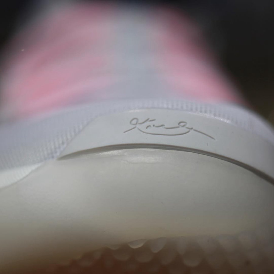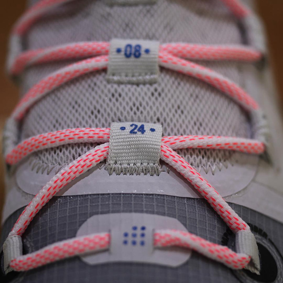 鞋款整体以白色为主调,细节中加入蓝、黑、淡粉三种颜色点缀,淡粉色的鞋带成为整双鞋的点睛之笔,搭载乳白色水晶底,与前几双已经曝光的配色相比的确清新了不少。