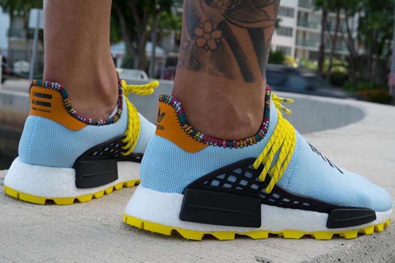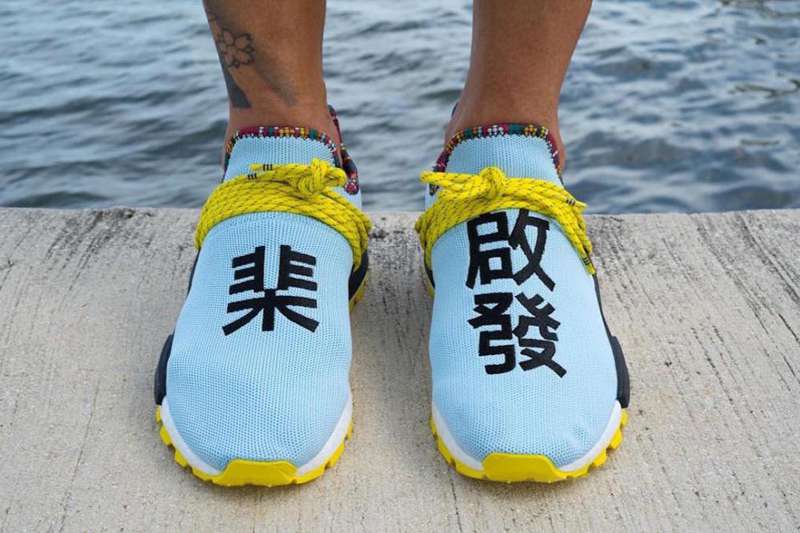 而其中这双 “Clear Sky” 的鞋身以浅蓝色为主色调,黄色鞋带和外底形成鲜明撞色,鞋领处标志性的 Pharrell 民族风格的念珠设计,而分别点缀在左右鞋面上的 “啟發” 和 “棐” 字样,使鞋款更具辨识度。