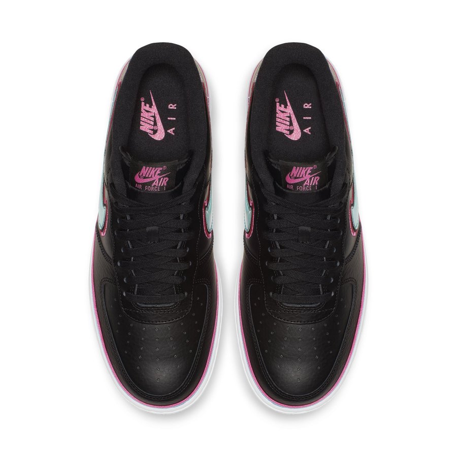 鞋款以黑色荔枝皮打底,中底上部辅以迈阿密南海岸风格的荧粉、湖蓝进行点缀,超高人气的撞色设计,绝对极具辨识度;再搭配与之呼应的南海岸撞色 Swoosh Logo,将流行设计与经典鞋型结合,致敬经典。