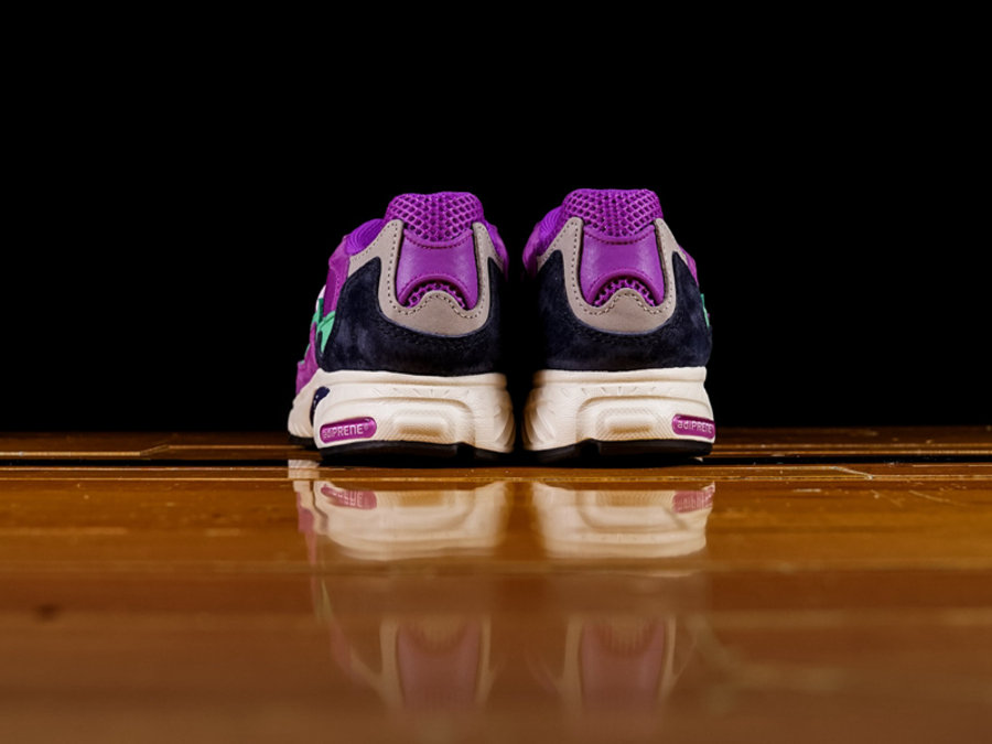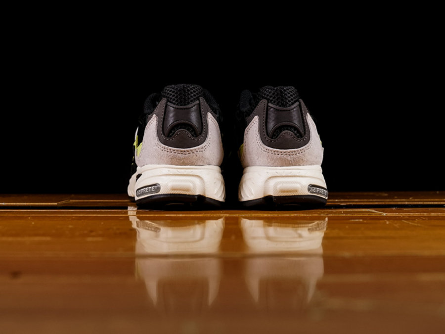 设计上延续极具层次感的复杂造型,但整体风格相比其他老爹鞋更具科技感。后跟有 adiprene 的科技标识,中足还有 TPU 稳定片,看来这双鞋曾经是一双专业慢跑鞋,借当下的老爹鞋热潮而得以回归。