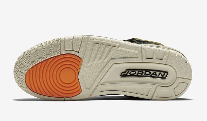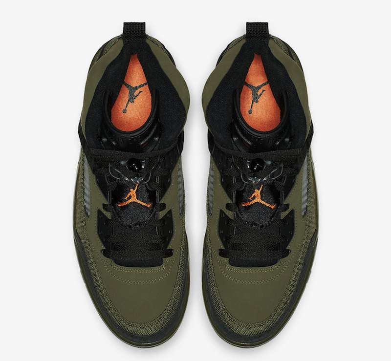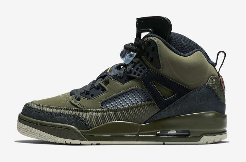 这双 Jordan Spizike 以橄榄绿为主色调,并在鞋舌、外底、后跟及鞋垫处用橙色进行点缀设计。标志性的爆裂纹设计更是致敬经典。