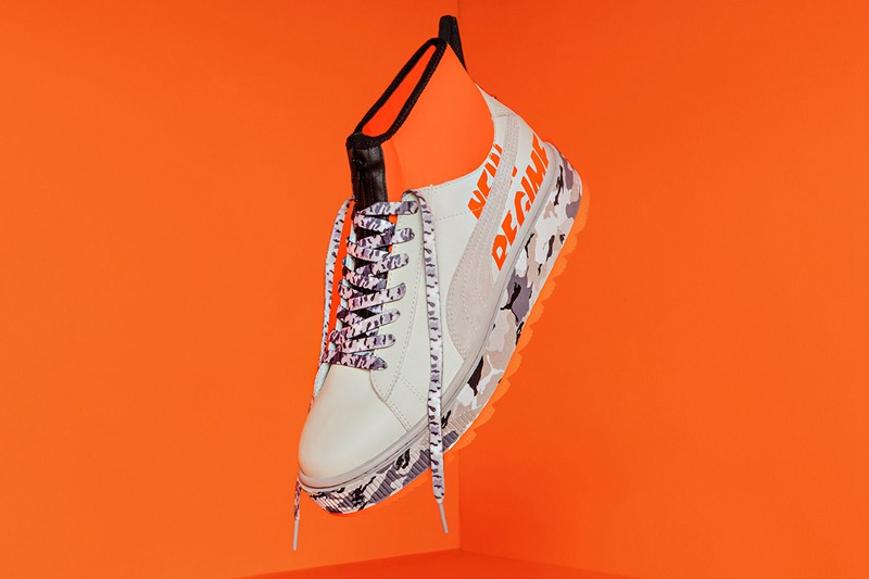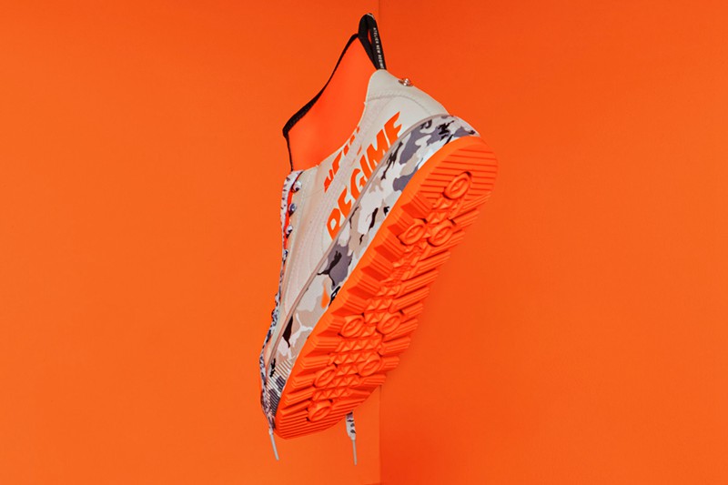 此番鞋款名为 Atelier New Regime x PUMA Ren Boot ANR,设计灵感来自摩托赛事。配色方案采用浅卡其色作为鞋身主色,并将 Atelier New Regime 招牌背景的亮橙色点缀于内层鞋帮、侧面 Logo 以及外底,同时在外层鞋帮、鞋带以及中底施以雪地迷彩。值得注意的是迷彩图案设计中融入了 PUMA Logo,可以说是颇为有趣了!